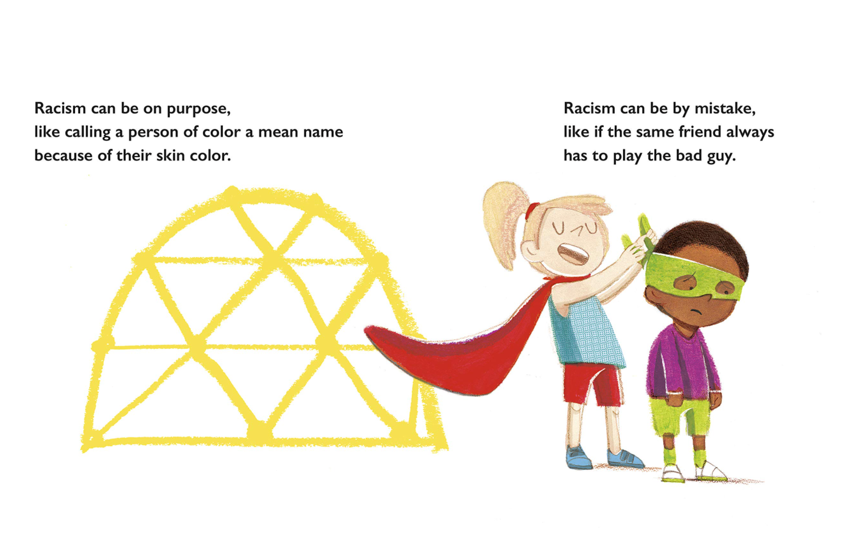 The illustrations depict humans of every hue, age, and size in so many shades of melanin. From there, the text transitions fluidly to explain, very succinctly, the pseudoscience behind white supremacy that led to racism. A few examples of what racism looks like in children’s worlds make this concept tangible and ripe with opportunities to keep the conversation going, which is precisely the purpose of this series of First Conversations books.